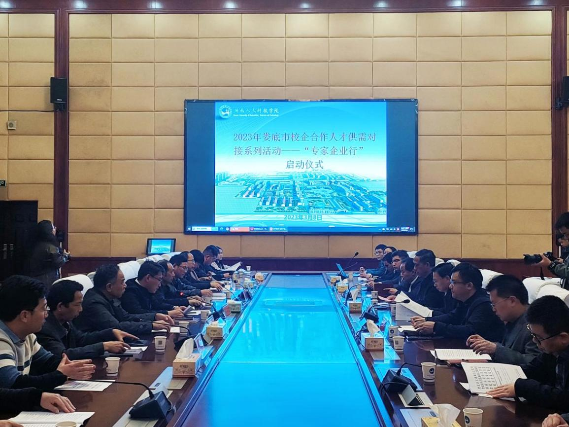 2023年3月8日,2023年婁底市校企合作人才供需對(duì)接“專家企業(yè)行”活動(dòng)啟動(dòng)儀式在湖南人文科技學(xué)院舉行。湖南人文科技學(xué)院黨委副書(shū)記、校長(zhǎng)劉鐵銘,婁底市人民政府原副市長(zhǎng)、婁底市企業(yè)聯(lián)合會(huì)、企業(yè)家協(xié)會(huì)會(huì)長(zhǎng)余明庭,市工信局黨組成員、副局長(zhǎng)肖鑒亮,市企業(yè)聯(lián)合會(huì)、企業(yè)家協(xié)會(huì)常務(wù)副會(huì)長(zhǎng)劉福高,參與“專家企業(yè)行”的專家教授等出席啟動(dòng)儀式。