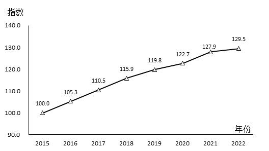 從測算結(jié)果看,以2015年為基期,2022年長三角區(qū)域發(fā)展指數(shù)為129.5,比上年提高1.6,與2015年相比,年均提高4.2。六個分領(lǐng)域指數(shù)均有所上升。其中,創(chuàng)新共建、綠色共保分項指數(shù)上升最快,年均提高超7.0;示范引領(lǐng)、協(xié)調(diào)共進(jìn)和民生共享分項指數(shù)平穩(wěn)提升,年均提高約4.0;開放共贏分項指數(shù)在波動中提高,年均提高1.0。