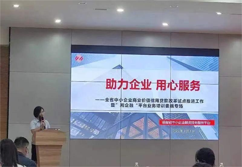 2022年9月6日下午,湖南省中小企業(yè)商業(yè)價值信用貸款改革暨“湘企融”平臺業(yè)務(wù)及融資服務(wù)能力提升培訓(xùn)活動在婁底經(jīng)開區(qū)創(chuàng)新大廈六樓舉行。此次活動由湖南省工信廳指導(dǎo),省中小企業(yè)服務(wù)中心、市工信局主辦,湖南省中小企業(yè)融資股份有限公司承辦,市中小企業(yè)公共服務(wù)平臺協(xié)辦。