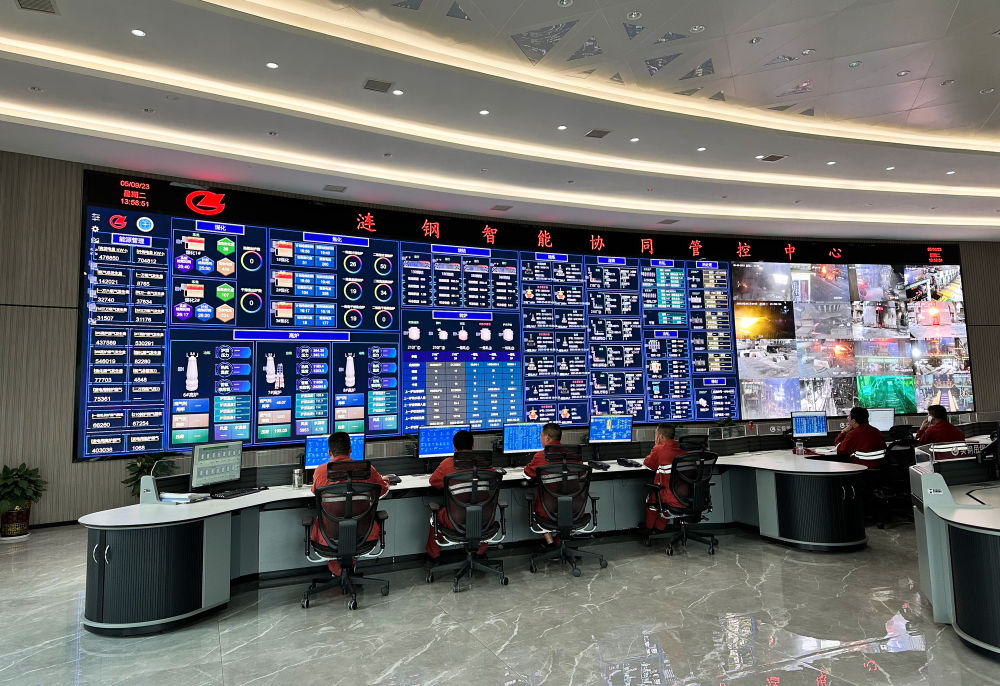 在漣鋼智能協(xié)同管控中心,LED屏幕上躍動(dòng)著煉鋼環(huán)節(jié)的各項(xiàng)數(shù)據(jù)參數(shù)和生產(chǎn)一線的實(shí)時(shí)畫(huà)面,技術(shù)工人正在監(jiān)測(cè)分析生產(chǎn)動(dòng)態(tài)信息。